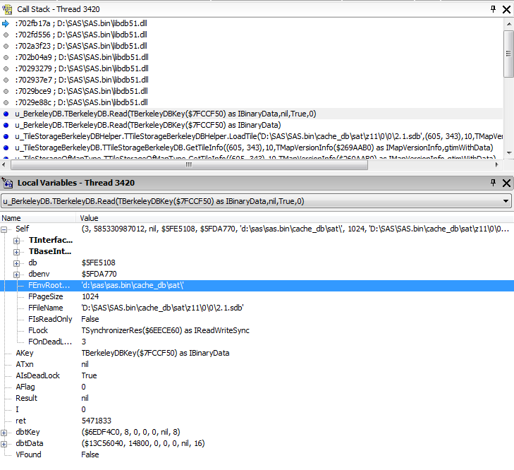 >Судя по скриншоту - словил дедлок: >> AIsDeadLock = True Не факт. Возможно просто осталось неинициализированное занчение левое. Обрати внимание, что I = 0, а зависло на ret := db.get(db, PDB_TXN(ATxn), @dbtKey, @dbtData, AFlag); то есть еще до любых записей в AIsDeadLock |