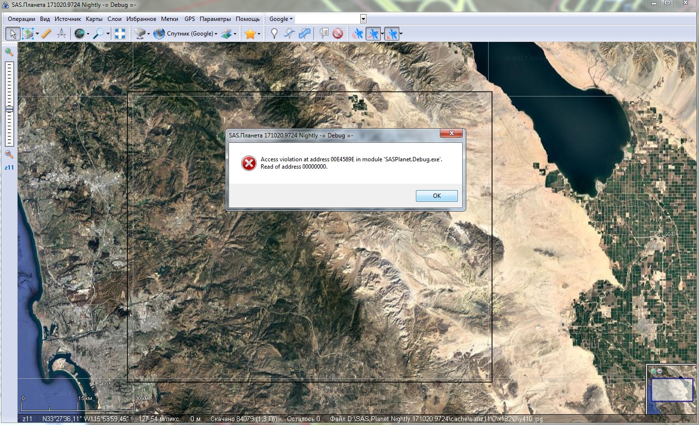 | Description | При загрузке территорий с ресурса Google, которые граничат с морем/океаном, там где нет тайлов, Сас планета зависает, как стабильная, так и ночная сборки. Сперва загрузка начинается, подтягивает тайлы, что есть в кэшэ, грузит немного из интернета, и затем перестает грузить вообще что-либо. В окне загрузки время бесконечно увеличивается. Планета не закрывается. Приходится убивать её процесс в диспетчере задач. Собственно из-за этого не могу сосздать файл багрепорта в дебаггере каждый раз. Один раз получилось вроде.. | ||||||||