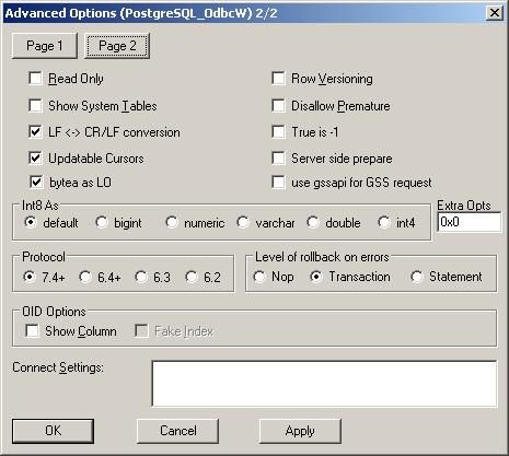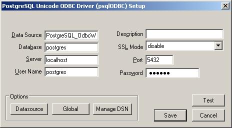 Так может прото драйвера ODBC нет родного для PostgreSQL? Он так и зовётся PostgreSQL ODBC Driver (UNICODE). В администраторе ODBC переходим на закладку System DSN и там создаём новый источник данных. Выбираем там (судя по всему ближе к концу списка) указанный драйвер (если его нет - надо качнуть с оф.сайта), а потом у самой записи настраиваем параметры. Приаттачил 2 картинки. |