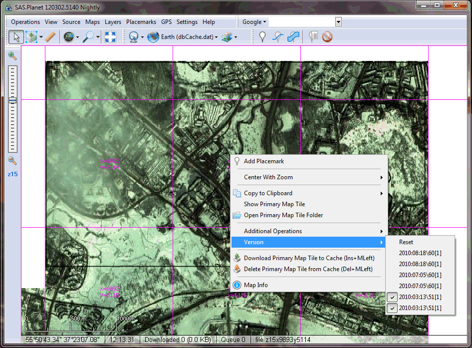 Что-то не получается. 120229.5122. Полазил в ГЕ по историческим снимкам, перебрал все даты в одном регионе. Закрыл, запустил САС, NameInCache=1. Вижу кашу из снимков разных лет. Кликаю правой кнопкой - Version -> там пусто. P.S. Если NameInCache=0, вижу последние снимки, в остальном всё то же. |