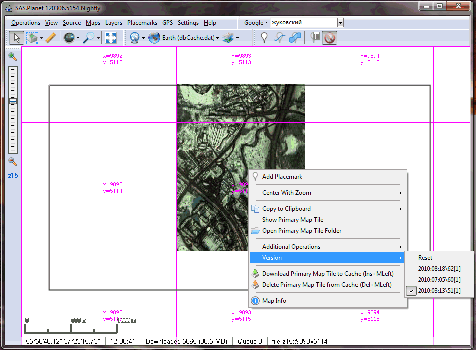 Сделал выбор версий тайлов GE либо по дате, либо только по номеру снимка. В разных местах (Земли) по-разному удобнее. Во всех случаях в скобках указана "версия", которую можно вбить в настройках карты, и будет тот же эффект, что и при выборе конкретного пункта меню. Менюшку перетащил под ДопОперации и переименовал для работы русификации. ps. Кэширование дат и версий для закэшированных снимков пока что отключено. Для включения (если вдруг понадобится в статусбаре что-то постоянно отображать) надо раскомментарить в файле u_MapType.pas создание кэша для TTileStorageGE. |