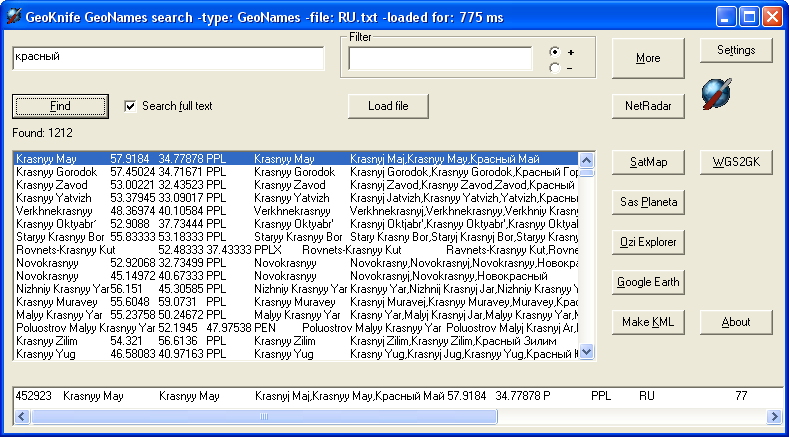 так не сравнивай базу в .txt и базу в .mp я поиск по RU.txt так же с результатом близким к geoknife забаццаю...(что там искать по тексту то) Только это отдельный гео-кодер будет и там "эталонные" базы , а здесь пользовательские, в которых больше вкусностей... |