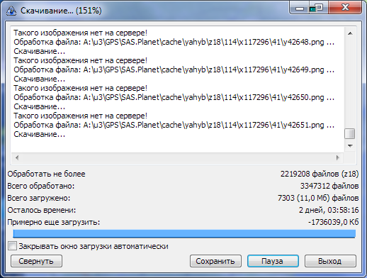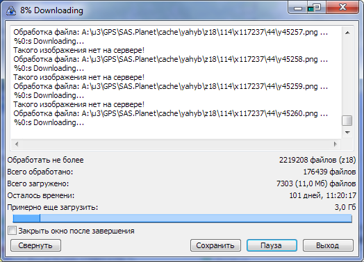 Теперь все правильно. У вас стоит в настройках возобновлять закачку с последнего "закачанного" тайла. А я смотрю вы качаете тупо по местам где нет на сервере ничего. Вот оно и откатилось назад до 7 процентов. Теперь инцидент можно точно закрывать. А сколько оно обещает, так то весьма приблизительный прогноз. |