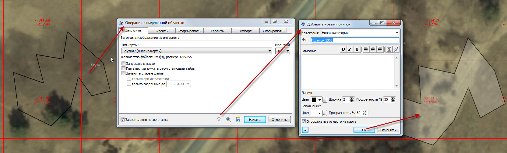 Зачем создавать "Историю ранее выделенных областей", когда можно выделенную область сохранить как Полигон в Метках? Полигон имеет все теже свойства по закачке, что и выбранная область. Для того чтобы создать Полигон - нажмите кнопку "Поставить метку" в окне "Операции с выделенной областью" и в появившемся новом окне дать Имя полигону и указать Категорию где он будет сохранен. На рисунке все показано. |