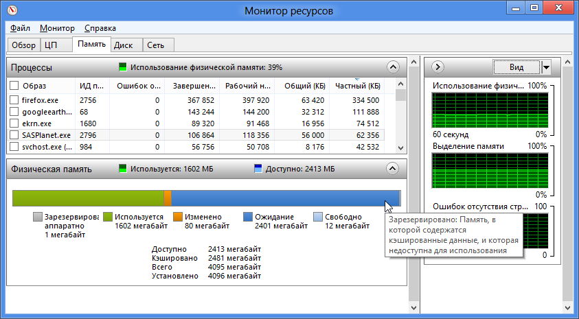 Ну, оно должно именно "упасть", а не просто тормозить. Вначале система может попытаться выдать сообщение о нехватке памяти и предложить закрыть самое прожорливое приложение. Если игнорировать это предложение и пытаться и дальше нагружать оперативку, таки будет или синий экран смерти или ещё что отвалится. Но это будут не просто "тормоза". И файл подкачки отключите, если он вдруг включен. Тогда на диск ничего свопится не будет. В linux кстати, идеологически заложено, что свободной оперативки в системе не должно быть. То что не используют приложения, обязательно займёт ядро под кэш. Это в винде привыкли, что оперативка ничем не занята. Хотя, у меня в win8 уже показывает, что как таковой, свободно 12 Мб, а более 50% "Зарезервировано" (см. аттач). |