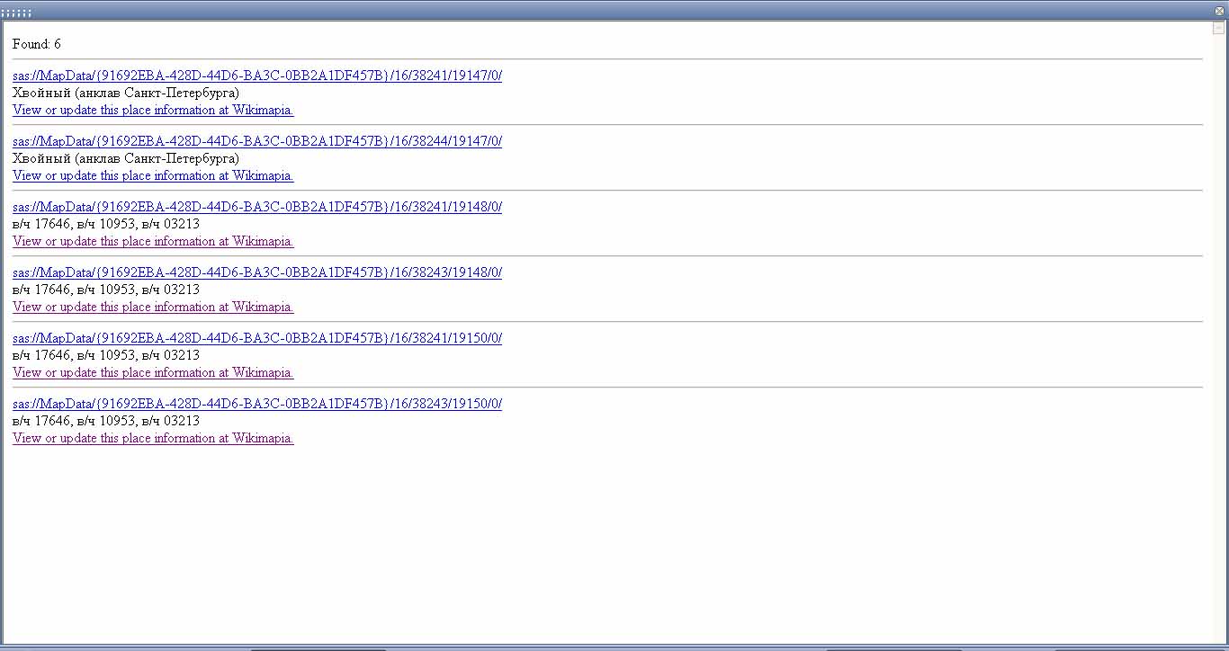 Так это разные объекты. Вот что выдаётся при клике на хинт: Found: 8 -------------------------------------------------------------------------------- sas://MapData/{91692EBA-428D-44D6-BA3C-0BB2A1DF457B}/16/38250/19033/0/ Радиоцентр №1 (Ольгино) View or update this place information at Wikimapia. -------------------------------------------------------------------------------- sas://MapData/{91692EBA-428D-44D6-BA3C-0BB2A1DF457B}/16/38254/19033/0/ Радиоцентр №1 (Ольгино) View or update this place information at Wikimapia. -------------------------------------------------------------------------------- sas://MapData/{91692EBA-428D-44D6-BA3C-0BB2A1DF457B}/16/38252/19034/1/ Воздушные фидерные линии View or update this place information at Wikimapia. -------------------------------------------------------------------------------- sas://MapData/{91692EBA-428D-44D6-BA3C-0BB2A1DF457B}/16/38253/19034/1/ Воздушные фидерные линии View or update this place information at Wikimapia. -------------------------------------------------------------------------------- sas://MapData/{91692EBA-428D-44D6-BA3C-0BB2A1DF457B}/16/38250/19035/0/ Радиоцентр №1 (Ольгино) View or update this place information at Wikimapia. -------------------------------------------------------------------------------- sas://MapData/{91692EBA-428D-44D6-BA3C-0BB2A1DF457B}/16/38252/19035/1/ Воздушные фидерные линии View or update this place information at Wikimapia. -------------------------------------------------------------------------------- sas://MapData/{91692EBA-428D-44D6-BA3C-0BB2A1DF457B}/16/38253/19035/1/ Воздушные фидерные линии View or update this place information at Wikimapia. -------------------------------------------------------------------------------- sas://MapData/{91692EBA-428D-44D6-BA3C-0BB2A1DF457B}/16/38254/19035/0/ Радиоцентр №1 (Ольгино) View or update this place information at Wikimapia. |