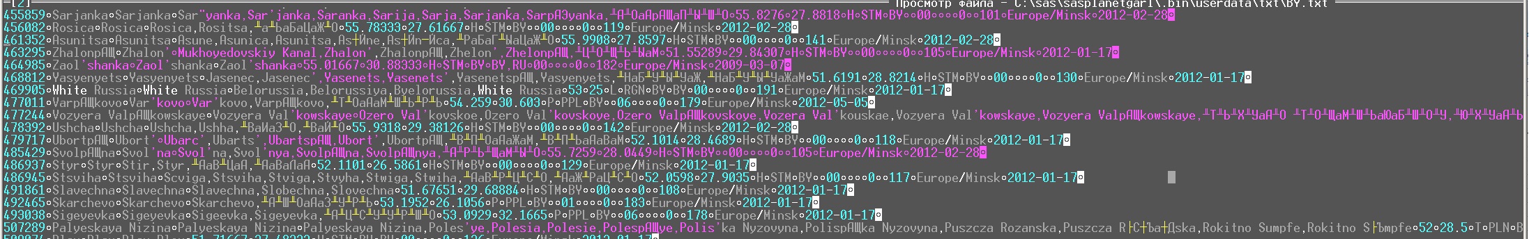 >Знаете, а настройка среды для разработки SAS, занимает несколько минут и даже есть готовая виртуалка А вот про это слышу впервые >Для тех кто хочет - преград нету, а остальные найдут сотню отговорок Желание есть огромное, другое дело как получится... У каждого программиста свой стиль, а посему все равно разруливать придется сперва. >Этими файлами (содержимым и форматом) заведуют ребята с geonames.org Оооо... ну это полный абзац. Вы хотите, чтобы неосведомленный человек что то сразу понял из того множества непонятных букф? |