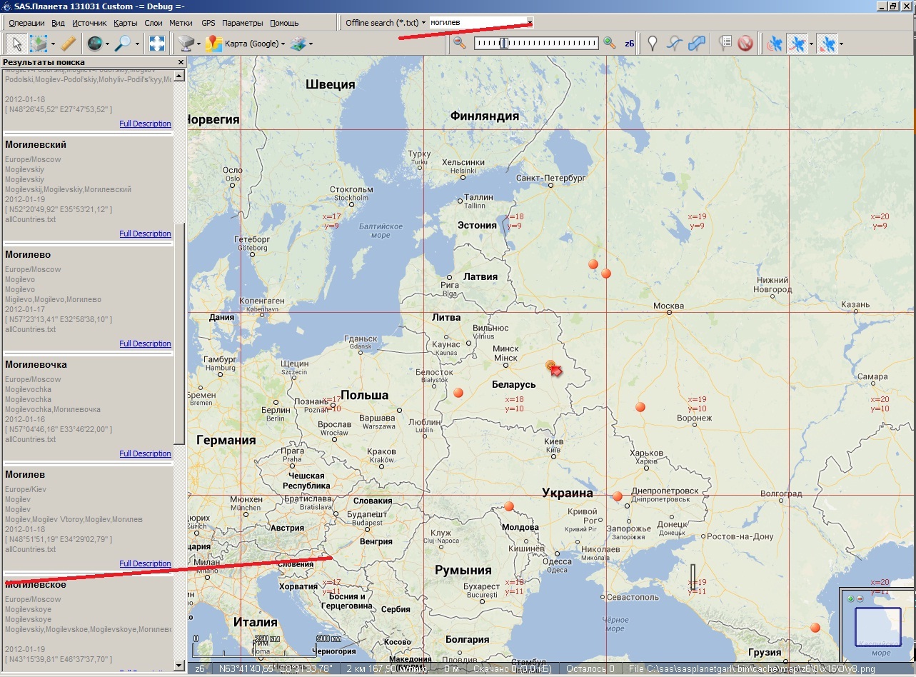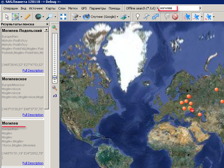 Смотрю комментов не добавилось, а появилась картинка после поиска по слову "могилев". Так вот, конфуз однако. На карте стрелка позиционирована верно, хоть не видно имени, но верно. Однако в предлагаемом списке красным подчеркнуто не является истиной. Присмотритесь внимательно, там написано "Europe/Kiev" а это есть Украина. А на Украине нет города "Могилев", есть "Могилев подольский". Если быть точным, то в кассах Ж/Д наш Белорусский Могилев у них идет как "Могилев на Днепре". Но не суть. Пока одобрям по поиску сказать не могу, если подчеркнуто именно то, на что вы считаете позиционирована стрелка на карте. |