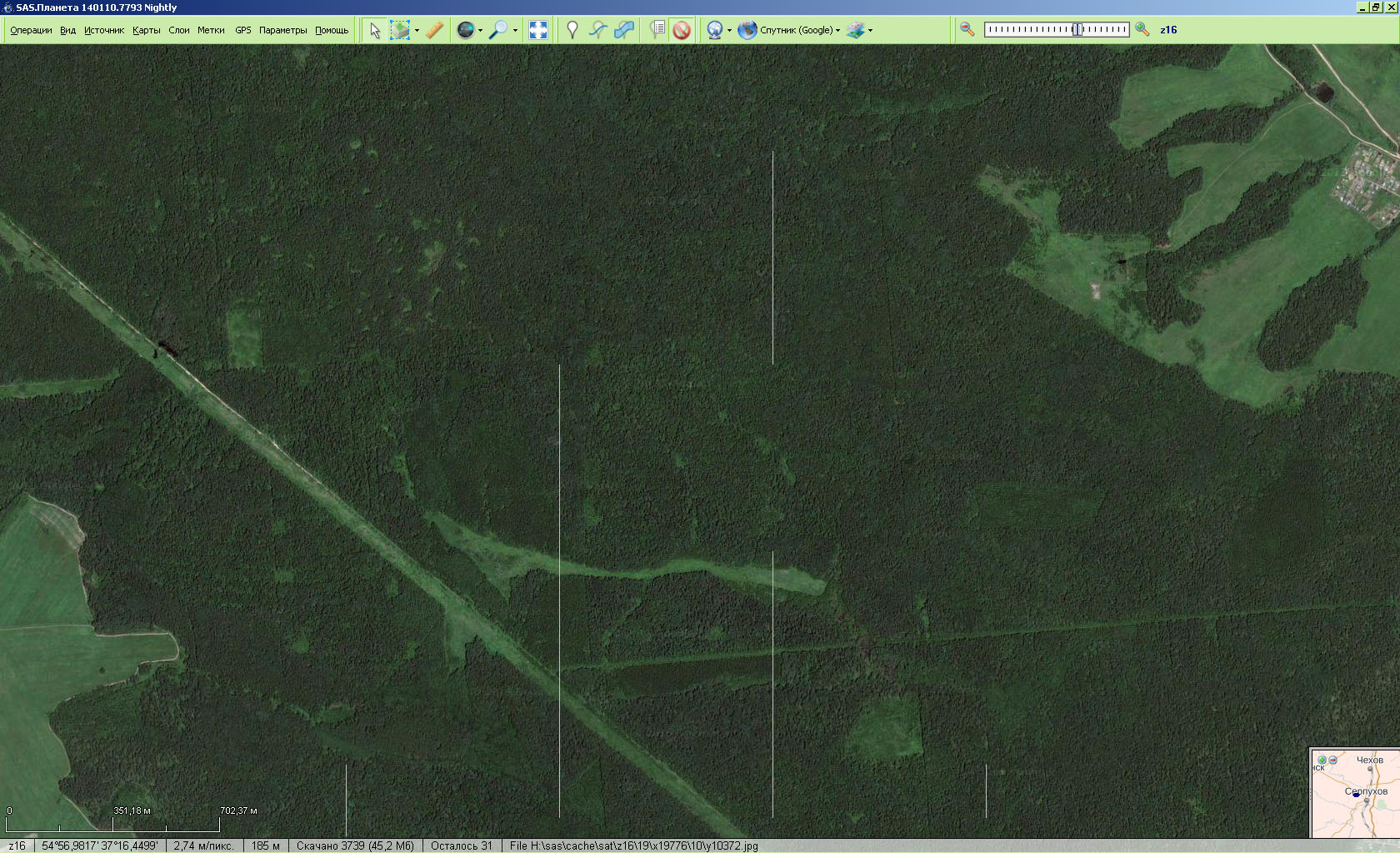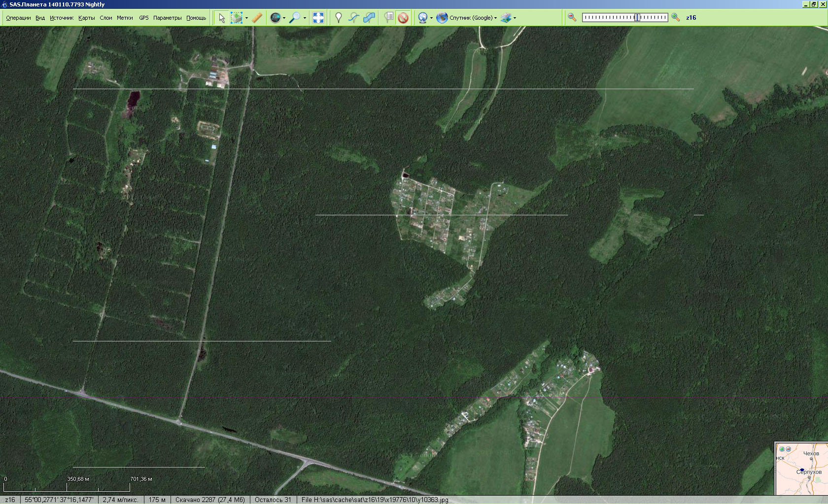 | Description | При просмотре карты (наверное любой, но виднее на спутниках) иногда появляются тонкие белые полоски -- границы тайлов. Если карту не трогать, они так и висят, если подвинуть -- исчезают, но через некоторое время могут появиться вновь. В принципе, не мешают, но отвлекают )) На снимке видно номер версии САСа, масштаб и имя спутника, но всё это было и раньше (на других версиях САС) и с другими спутниками и масштабами. | ||||||||