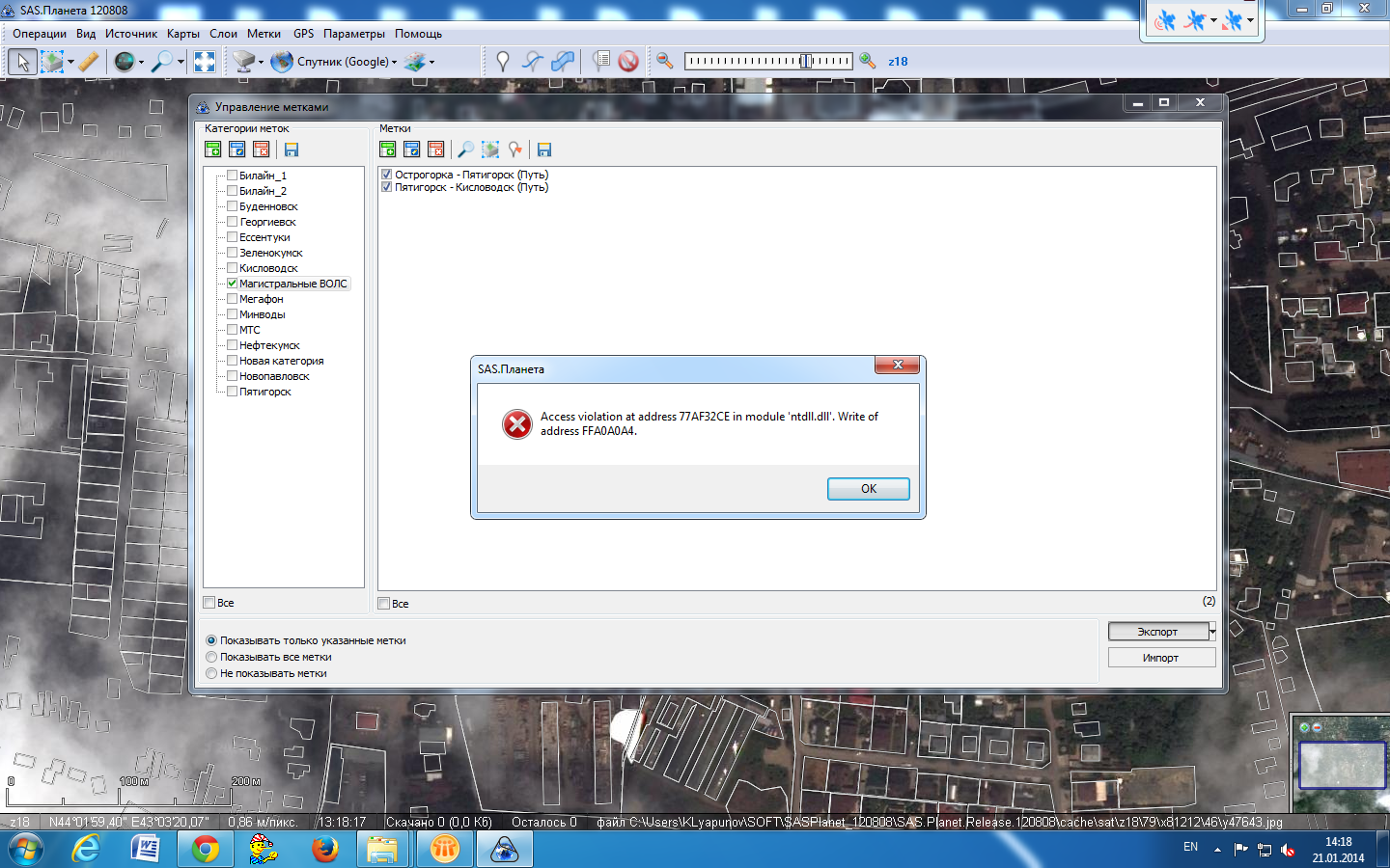 SAS.Planet.Nightly.140122.7812 Последовательность действий 1. Управление метками- экспорт- ошибка. 2. Управление метками- импорт- ошибка. 3. Левый клик на рабочем поле с картой -ошибка. 4. Помощь - сайт программы - ошибка -вылет. 5. Помощь - баг трекер - ошибка -вылет. Теперь постоянно на дебажной версии EXE. Файлы с метками и ELF приложил. |
