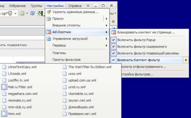 Вот, нашёл в Maxthon2 то, что предложил здесь. Там пункт меню "Настройки"-"Ad-Охотник"-"Включить Контент-фильтр" реализован примерно так. Ну не совсем так по форме, зато по смыслу именно то, что предлагается тут. См. второй скрин. |