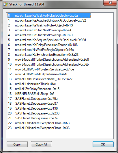 Вновь несколько раз споймал очень похожий вылет. После нескольких часов загрузки наглухо зависла. Работал с яндекс-картами а до этого с GeoCacher direct. Версия была не дебаг, вылетело лишь окошко с ошибкой (приаттачил). Параллельно была запущена GE и программа зависла после того как я закрыл GE. Запустил дебаг версию, и буквально после 10 минут c GeoCacher direct опять зависла намертво: экран программы белый, курсор крутится. Ждал минут двадцать, после убил (никакого SASPlanet.Debug.elf не получилось естественно), предварительно сделав дамп памяти (Может поможет как :) ). https://mega.co.nz/#!HpVhhBAY!eUrle0-bwq8R1ZOMb2WBLBdkQZ3crBcD458byjcKT10 Вообще ощущение, что это связанно либо с сетью, либо с GE. Часто замечаю, что когда запущена планета и GE одновременно, часто вылетает либо то, либо другое. |