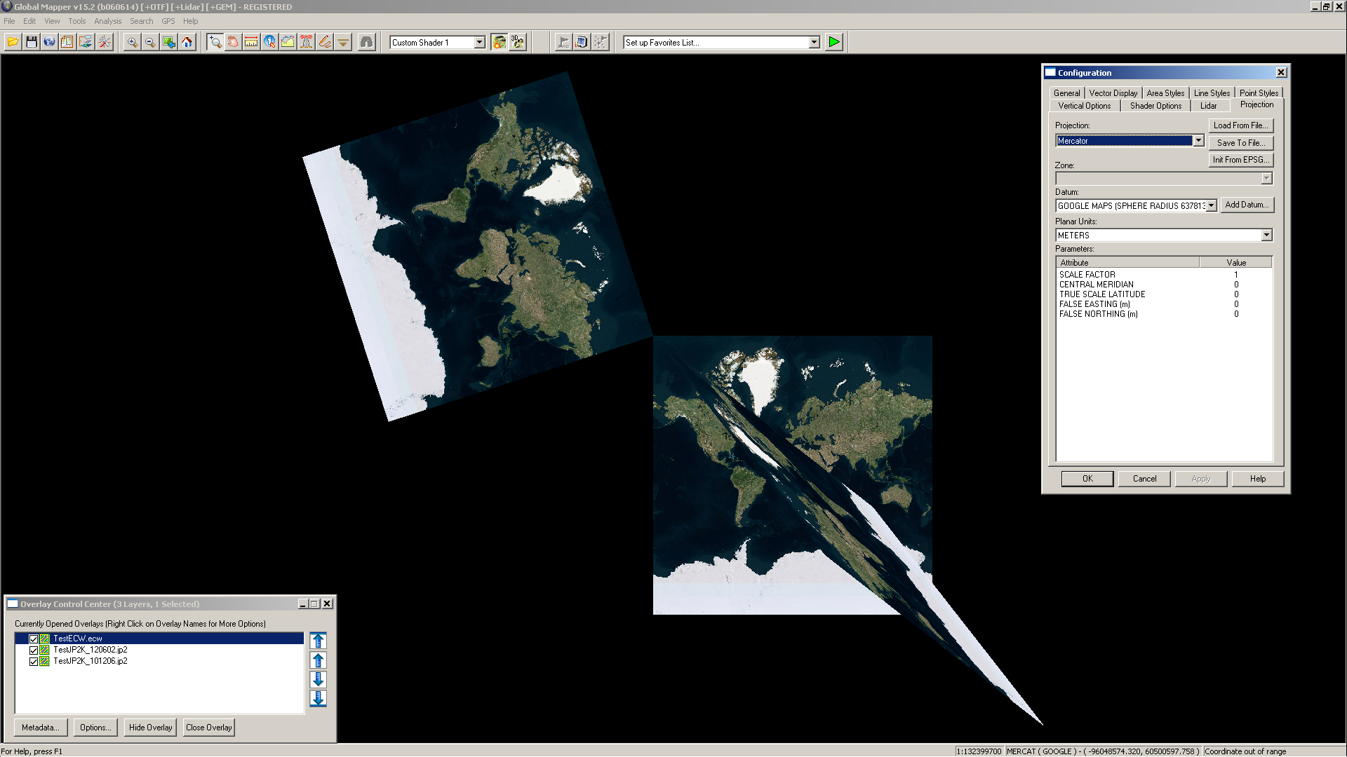 В чём заключается некорректность привязки? Проблема была всегда или появилась в какой-то момент (какой)? В том, что JPEG2000 из САС-а криво ложатся на карту мира. Остальные форматы,типа ECW, отображаются нормально. Думаю, дело в некорректном заполнении метаданных, в теле JP2-файла, поскольку сопутствующие файлы привязки, типа*.map или *.w совершенно корректны. И эта проблема была всегда и во всех версиях САС, которыми я пользовался. Откопал версию 101206 — так JP2-файлы из неё пусть и не "гнутся" причудливым образом, но поворачивается на некоторый угол. Прикрепляю ещё скрин, со всем этим безобразием. Повторюсь: с другими форматами таких проблем нет. |