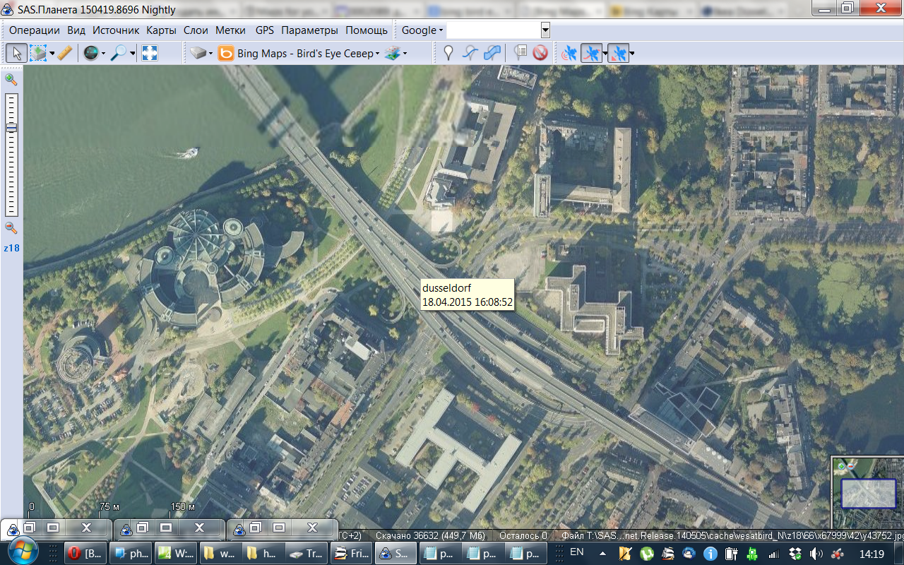 В браузере: Мадрид, Дюссельдорф - как и положено в 3d (вид птицы).