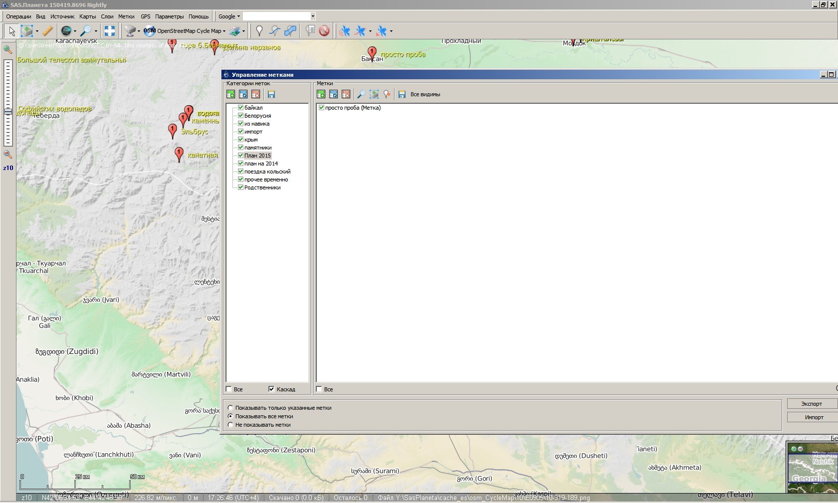 | Description | в окне "отображение меток" видны только категории, сами метки не видны (именно в этом окне). Все галки стоят, но на карте метки не показываются. Если поставить чекбокс "показывать все метки", то на карте они появляются, но все равно их не видно в окне "отображение меток", т.е. нет самого списка меток. Далее, делаем экспорт ВСЕХ меток - получаю пустой файл. Но, метка созданная уже в этой версии программы прекрасно видна и в списке меток и на карте, и работает как положено. | ||||||||