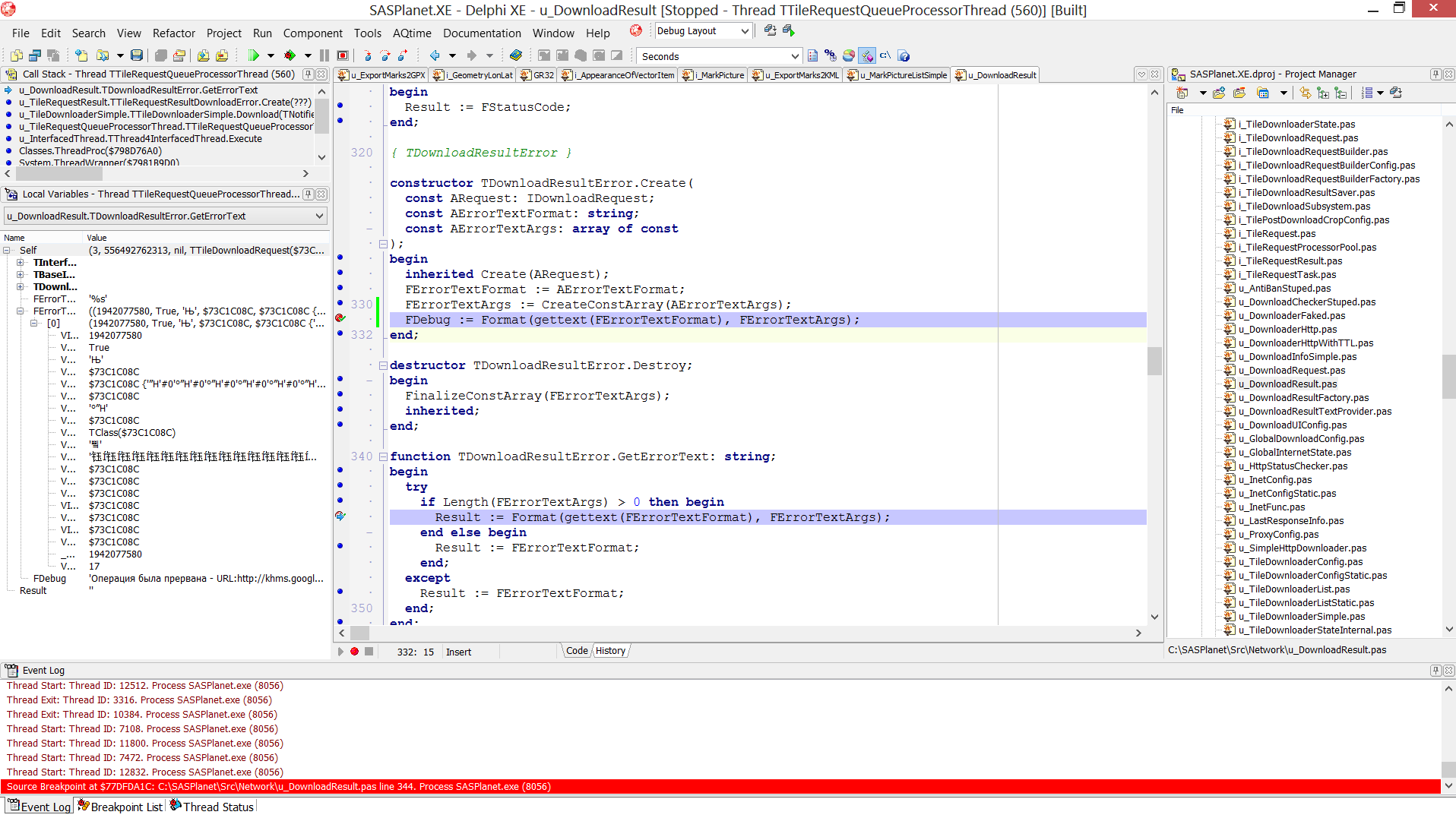 | Additional Information | Пример стека: :75cb0192 KERNELBASE.RaiseException + 0x49 :0040769c NotifyNonDelphiException + $1C :77e12bd3 ntdll.RtlRaiseStatus + 0x86 SysUtils.WideFormatBuf(???,???,???,2,(...),$CD9898) SysUtils.FormatBuf(???,???,???,2,(...),$CD9898) SysUtils.FmtStr(???,'%s',(...),$CD9898) SysUtils.Format(???,???,$CD9898) SysUtils.Format(???,???) u_DownloadResult.TDownloadResultError.GetErrorText u_TileRequestResult.TTileRequestResultDownloadError.Create(???) u_TileDownloaderSimple.TTileDownloaderSimple.Download(TNotifierOneOperationByNotifier($7FC7CC98) as INotifierOneOperation,TNotifierOperation($797FF428) as INotifierOperation,0,TTileRequest($73C69A20) as ITileRequest) u_TileRequestQueueProcessorThread.TTileRequestQueueProcessorThread.Execute u_InterfacedThread.TThread4InterfacedThread.Execute | ||||||||