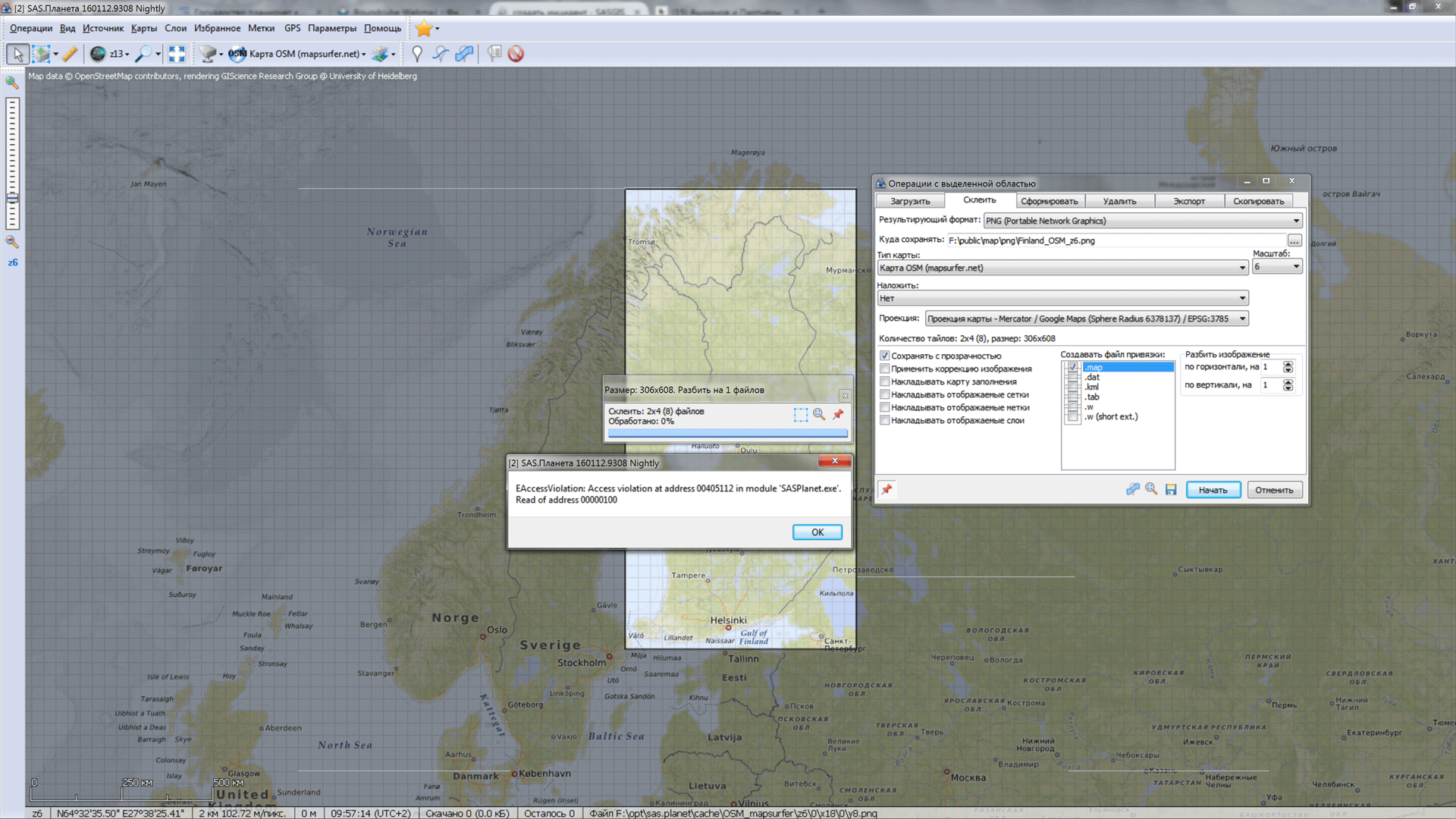 | Description | При попытке склейки карты после запуска появляется сообщение об "EAccessViolation: Access violation at address 00405112 in module SAS.Planet. Read address 00000100". Файл изображения создается, но формат - некорректный. | ||||||||
