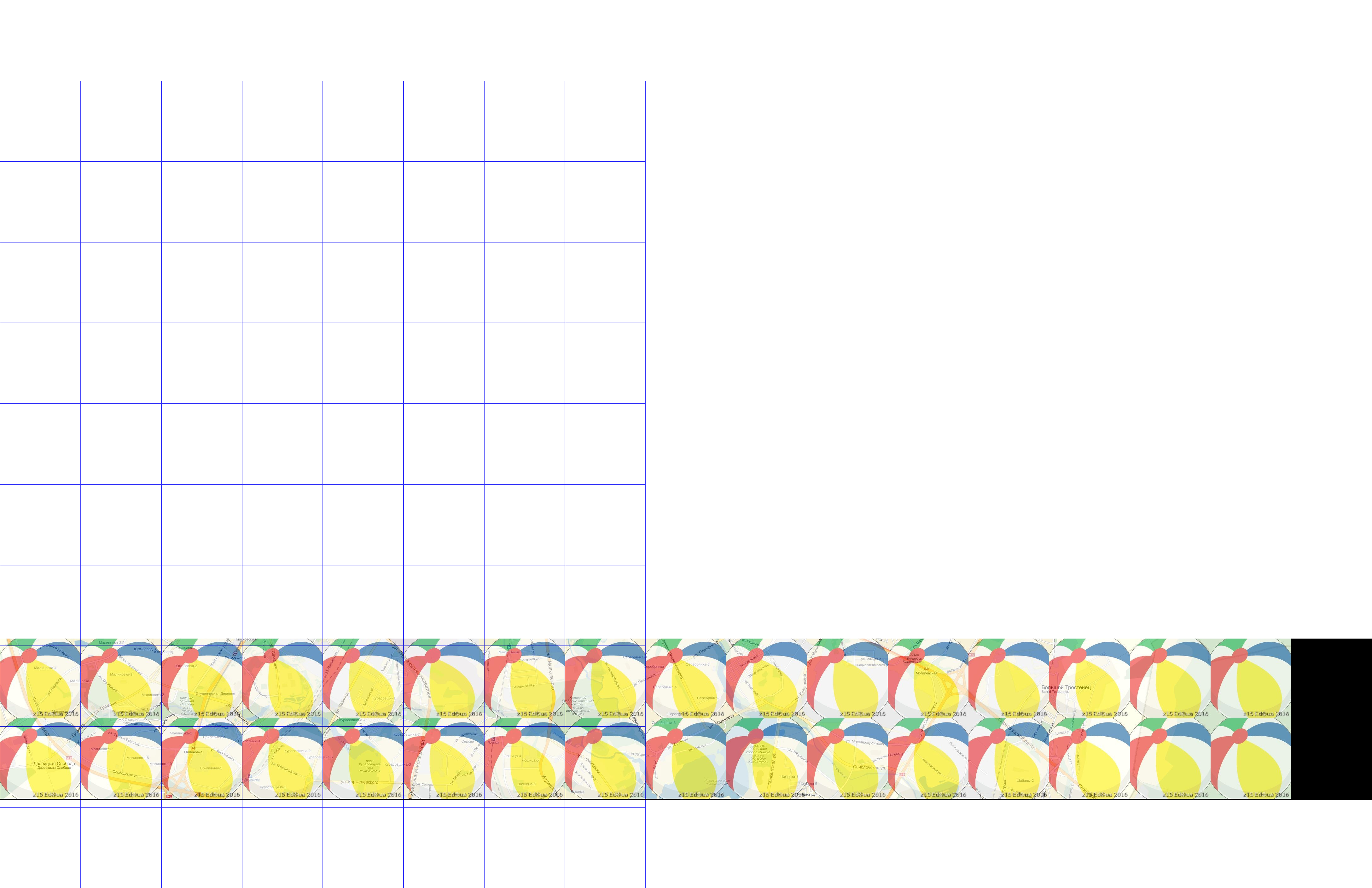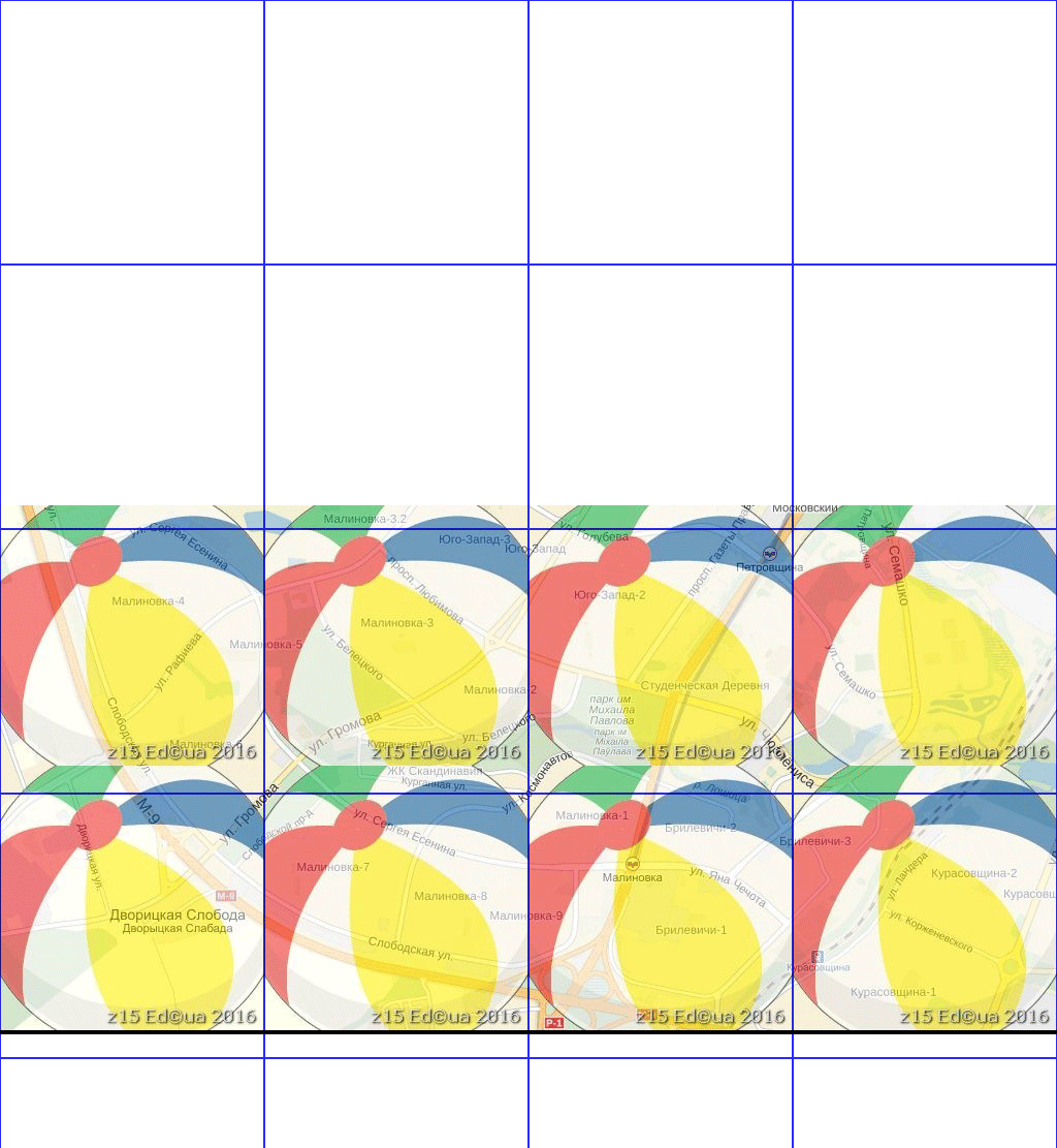 Cиним - сетка тайлов первого, большего контейнера .а00 Если фрагменты карты совместить то видно, что тайлы фрагмента со второго .а00 смещены по вертикали относительно тайлов первого фрагмента |