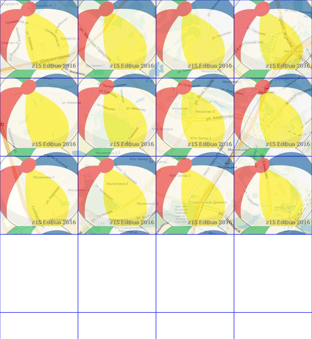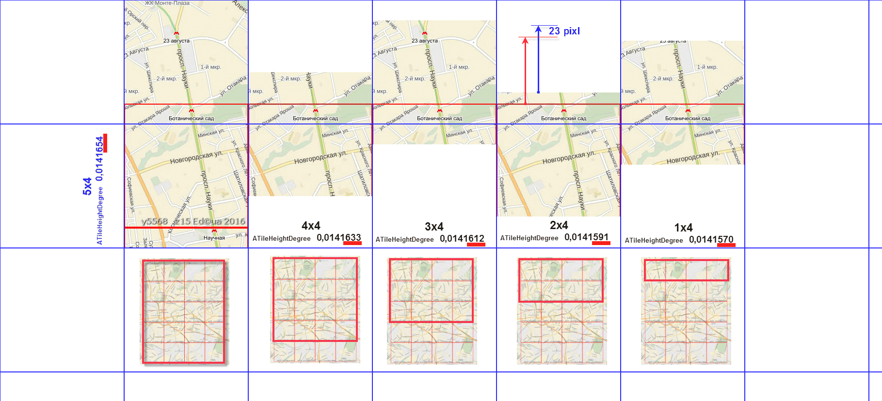 У меня есть мысли по п.1 но сначала п.2 Ну тогда задача сводится к обратной. Для нарезки, которая бы начиналась по границам тайлов, нужно подобрать (вычислить) нужное разрешение ATileHeightDegree и если хватит точности то возможно получится нарезать тайлы которые впишутся в меркатор (в достаточно малой выделенной области). И тут у меня вопрос, как собственно нарезка делается сейчас? Тоесть как определяется ATileHeightDegree? А можна в качестве эксперимента мне тупо для z15 заказать это разрешение ATileHeightDegree, скажем 0,0141157165, чтоб сделать нарезку выделенки возле широты 50°? |
