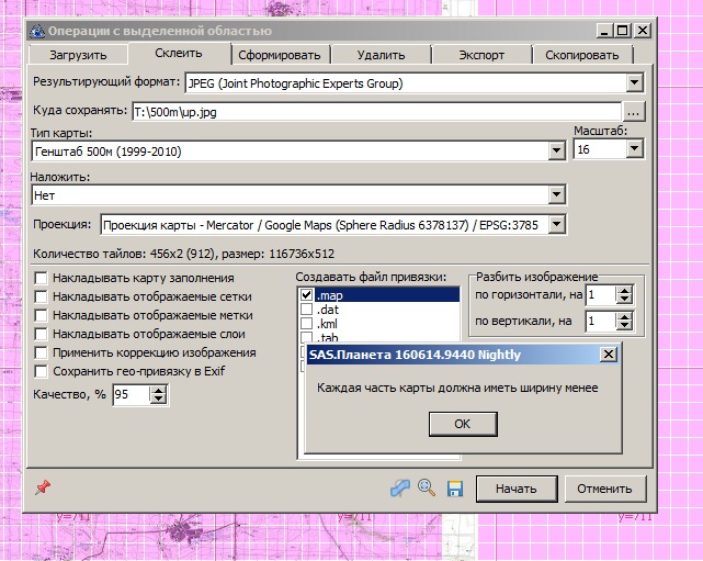 | Description | Что программа хочет сказать этим сообщением? Просто пытаюсь склеить jpeg из карты | ||||||||