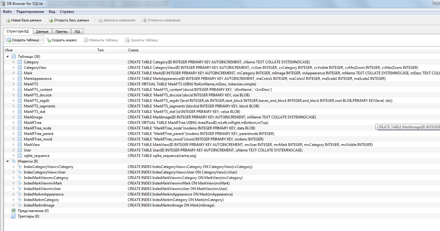 Названия вроде "говорящие". Вот тут есть комментарии (каждый класс - таблица в БД): u_MarkSystemORMModel.pas. Для RTree и FTS, SQLite создаёт ещё несколько служебных таблиц (все, что с нижним подчёркиванием в названии). Ночная версия собралась, протестируйте уже и её. |