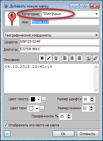Точно, тильду нажимал! Но нажимал для того, чтобы по умолчанию изменить цвет текста, тени и размер шрифта. Не подумал, что и категория запомнится. Из секции "[MarkNewPoint]" просто удалил строчку "CategoryName=ПЛАН\Крым" и всё заработало как надо. Спасибо за обалденную программу!!! Инцидент можно закрывать. |