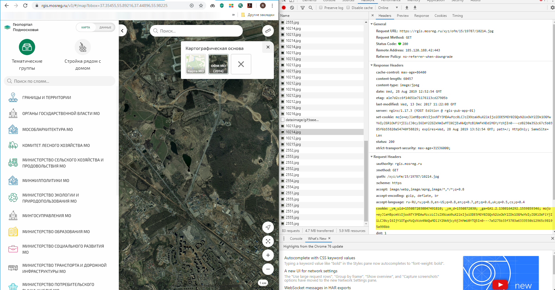 обновил zmp (MOsat_2.zmp.rar) и процедуру Каждый раз при работе с RGIS, надо начинить с вебверсии, для определения нужного cookie см. рис. 1 1. Открываем Хром (или любой другой браузер) 2. заходим на сайт RGIS, включаем режим ОФМ МО 3. Включаем Инструменты разработчика (ctrl+shift+I или через меню браузера) 4. если надо двигаем карту, чтобы прогрузились таилы в окне DevTools. 5. копируем ВСЮ строчку cookie (включая "cookie:") 6. запускаем СасПланет включаем карту RGIS 7. включаем Параметры карты (ctrl+alt+P) и вставляем эту строчку в ячейку с "Дополнительные HTTP заголовки:" |