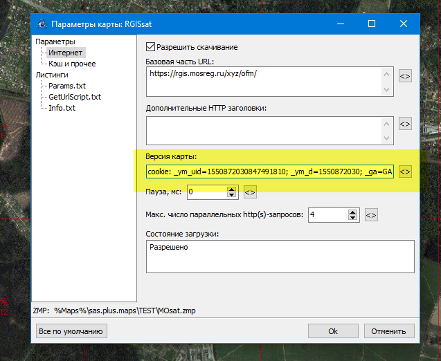 Новый zmp приложил (MOsat.zmp.rar). Каждый раз при работе с RGIS, надо начинить с вебверсии, для определения нужного cookie см. рис. 1 1. Открываем Хром (или любой другой браузер) 2. заходим на сайт RGI, включаем режим ОФМ МО 3. Включаем Инструменты разработчика (ctrl+shift+I или через меню браузера) 4. если надо двигаем карту, чтобы прогрузились таилы в окне DevTools. 5. копируем ВСЮ строчку cookie (включая "cookie:") см. рис. 2 6. запускаем СасПланет включаем карту RGIS 7. включаем Параметры карты (ctrl+alt+P) и вставляем эту строчку в ячейку с "Версия карты" Как только перестает грузить, проделываем всю процедуру заново. У сервера, возможно, есть защита. После некоторого числа скачивания (где-то 20-30 тайлов), сервер начинает отдавать беспорядочные тайлы. Тогда надо подождать минуты 2-3 и перезапустить Саспланет. |