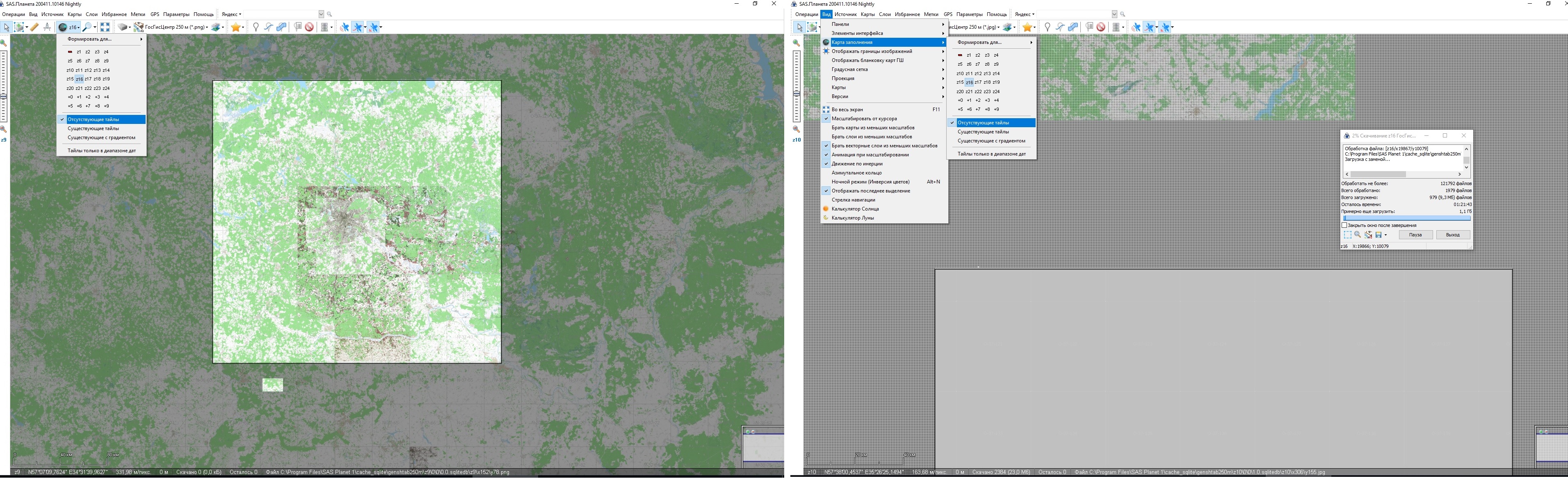 DescriptionШаг 1: Выбираем основную карту - ГосГисЦентр 250м (*.jpg). Выделяем область. Включаем карту заполнения. Начинаем закачку кэша выделенной области. Наблюдаем прогресс загрузки тайлов на карте заполнения вплоть до полного скачивания всех тейлов по карте заполнения.