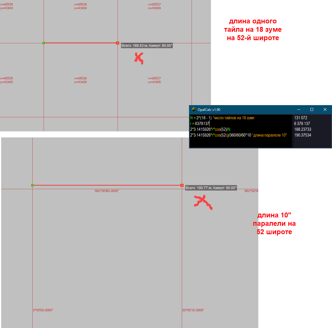 | Description | Если измерить расстояние вдоль параллели на экваторе, то расстояние совпадет с вычисленными. (рис. 1) Если уже измерять на более северных широтах (например, 52-я широта), то при измерении, например 10 секунд длины параллели есть расхождения с расчетными (рис. 2). Все тоже самое относится и к измерениям длины тайла. | ||||||||