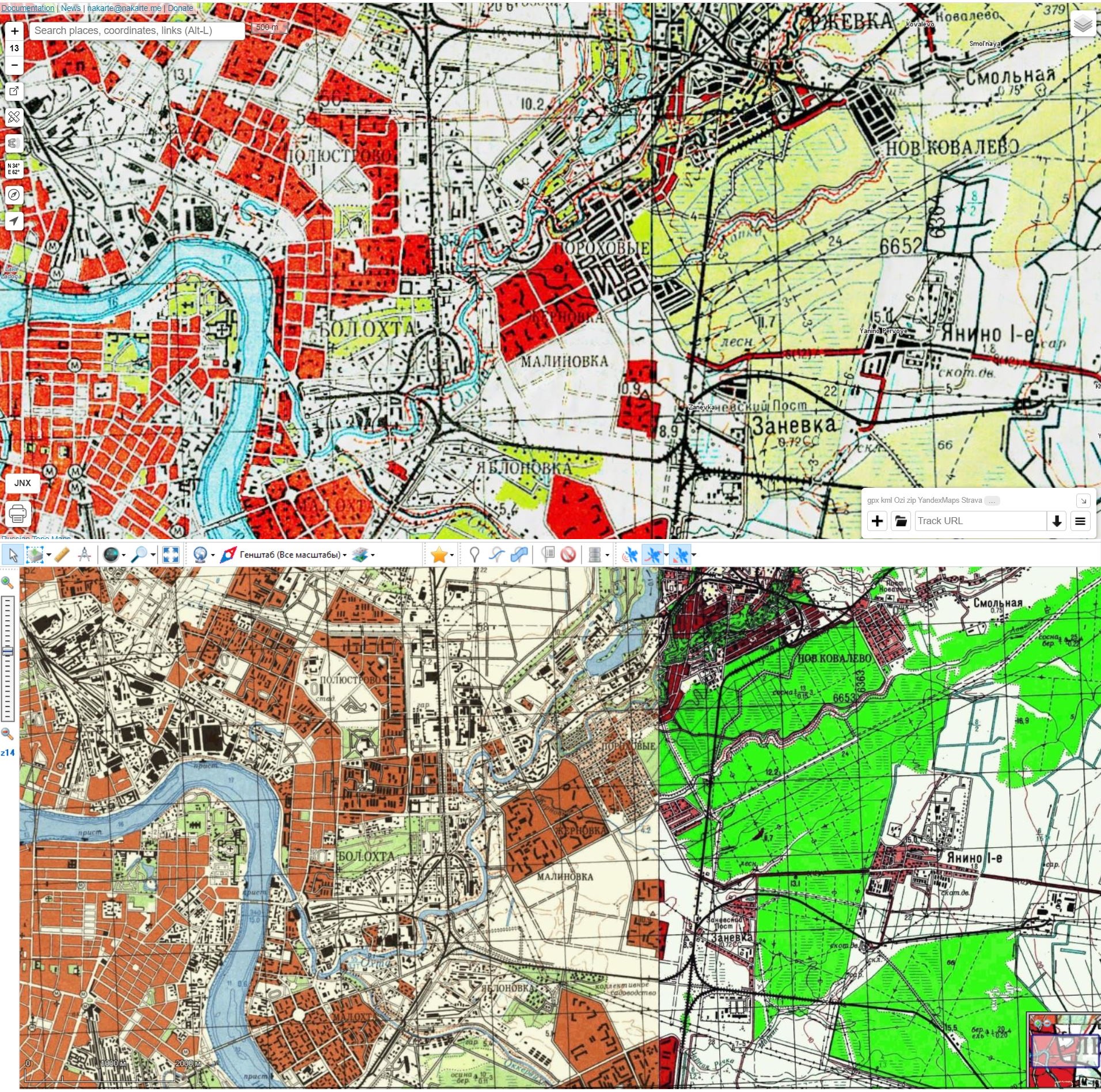 | Description | Добрый день. Если открыть в программе слой Генштаб (все масштабы), допустим Санкт-Петербурга и сравнить с аналогом на сайте nakarte.me видна существенная разница между картами. При этом если начать переключаться между Генштабом разных масштабов, то тайлы вообще не прогружаются. Вопрос - как установить в программе тот же источник, откуда берет тайлы сайт nakarte.me? | ||||||||||||