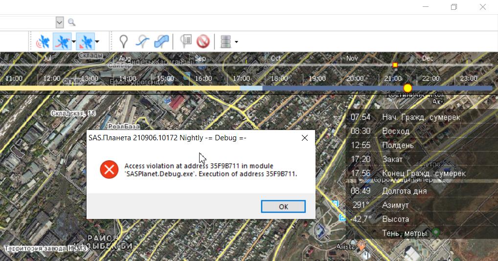 Да, падает при отрисовке полигона. Можно ничего не делать, кроме как крутить колесо, меняя масштаб и гуляя по карте и поймать ошибку. С калькулятором солнца дела не имел. Без подсказки даже и не найду где это включается. |
