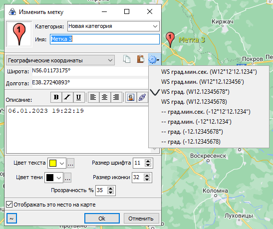 | Description | В выпадающем списке "Сменить формат представления координат" в Свойствах метки указывать текущий формат представления - либо галкой, либо радиокнопкой, либо подсветкой пункта меню. Примерно как на скрине. | ||||||||