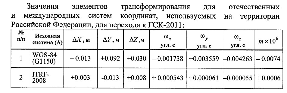 7 параметров преобразования отображены на картинке (прикрепил файл). Параметры общего земного эллипсоида для ГСК-2011 Большая полуось 6378136,5 м, Сжатие 1/298,2564151 |