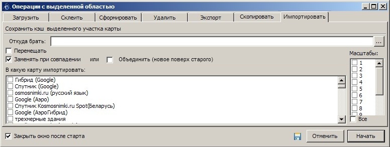 zed, именно. кстати не важно в каком формате кэш приёмник. главное, что бы кэш-донор был в формате png с прозрачным фоном. Tolik, скомбинировать. Сейчас vdemidov будет на меня снова шуметь, что не мне решать, но: как мне кажется (подчеркнуто), в САС все инструменты для этого есть. т.е. файловые операции с кэшем - есть, действие при совпадении тайлов - есть, объединение тайлов (один на другой) - есть. В заголовке я написал, что эта операция никак не связана с выделенной областью, т.к. предполагал импорт всего кэша-донора, хотя (наверное) можно и ограничить выделенной областью. Но это уже на усмотрение разработчиков - как оно лучше впишется в программу и в данное окно. Если делать выбор области для импорта, то лучше предусмотреть опцию "Импортировать всё". Можно обойтись и без этой галочки, если при создании кэша-донора создавать описывающую его область (в ГМ это делается легко) и сохранить вместе с кэшем в формате kml. |